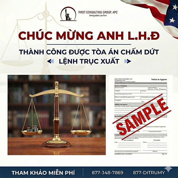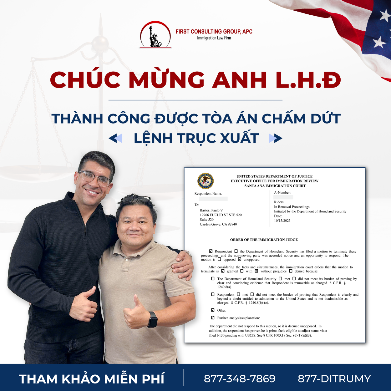 Kết quả thành công: Tòa án đã đồng ý chấm dứt thủ tục trục xuất, giúp anh L.H.Đ. tiếp tục ở lại Mỹ hợp pháp.