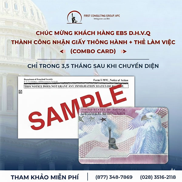Chúng tôi xin gửi lời chúc mừng đến khách hàng D.H.V.Q, người phối ngẫu đi kèm trong hồ sơ của nhà đầu tư EB5, khi anh đã nhận được Combo Card (bao gồm thẻ làm việc – giấy thông hành) chỉ trong 3,5 tháng sau khi chuyển diện!